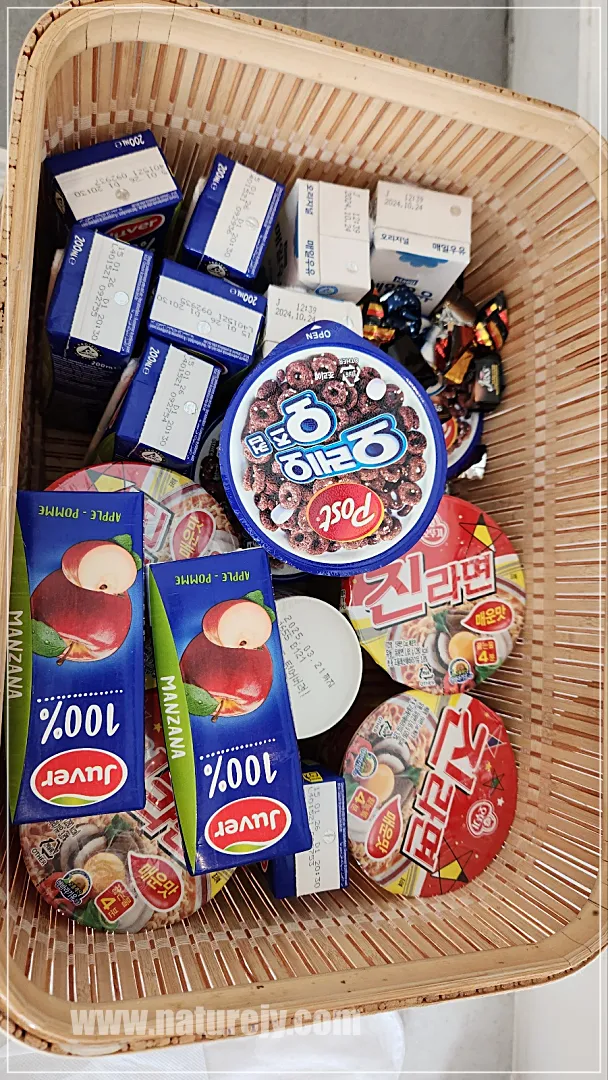 현관 바로 앞에 나무 바구니 안에 가득가득 웰컴 푸드, 드링크가 들어있어요.