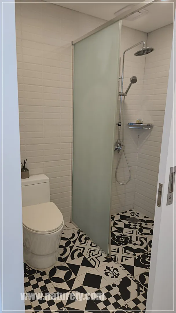 여기 화장실은 세면대, 변기, 샤워부스가 다 있습니다.