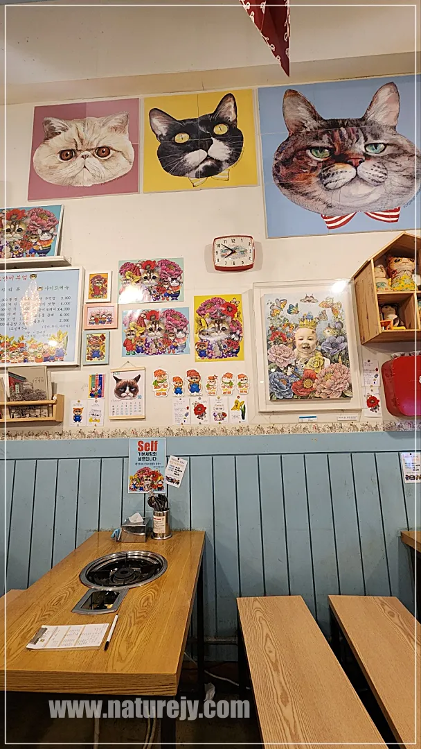 벽에 한가득 고양이 그림이 걸려있어요.