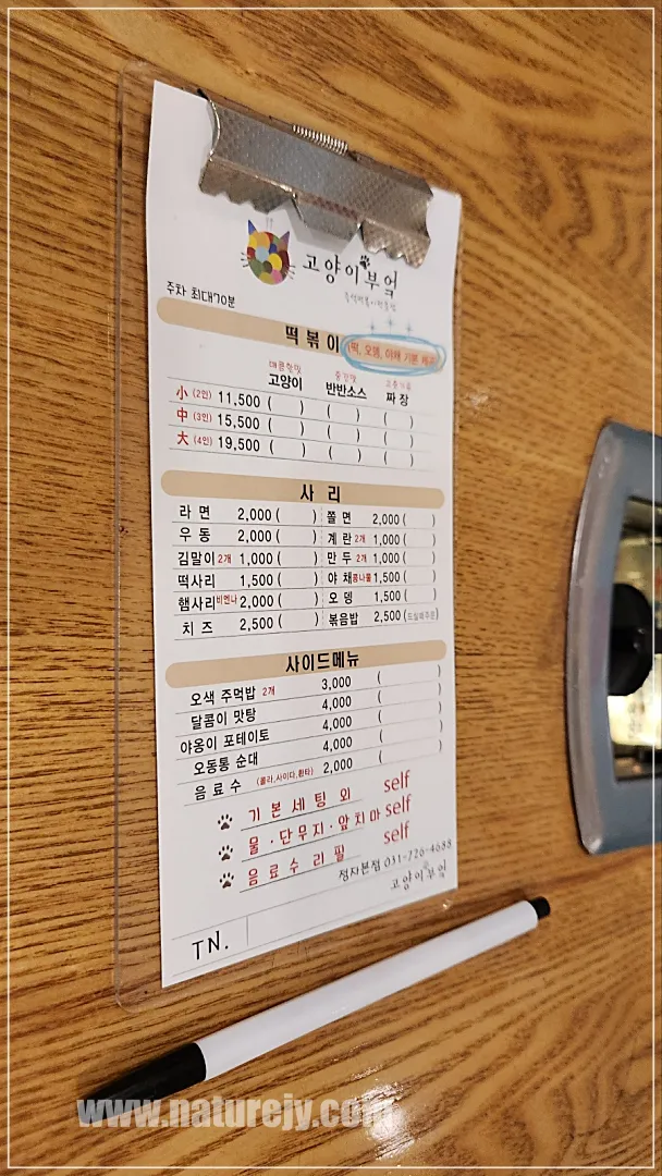 고양이 부엌에 들어가서 앉으시면 테이블마다 주문서가 있어요.