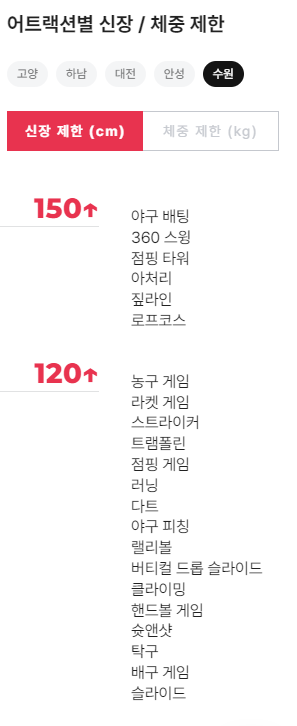 아이들이 아직 150cm이 되지 않다보니 이용할 수 있는 게 제한이 있었는데요.