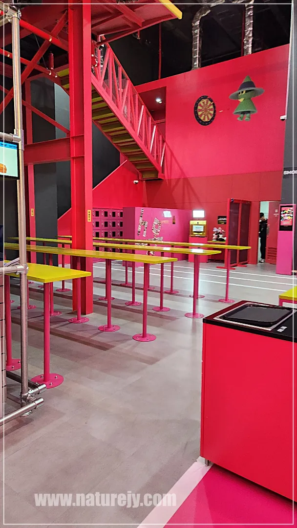 구입한 음식을 저기서 먹을 수 있어요. 뒤에 사물함도 이용할 수 있는데 무료랍니다.