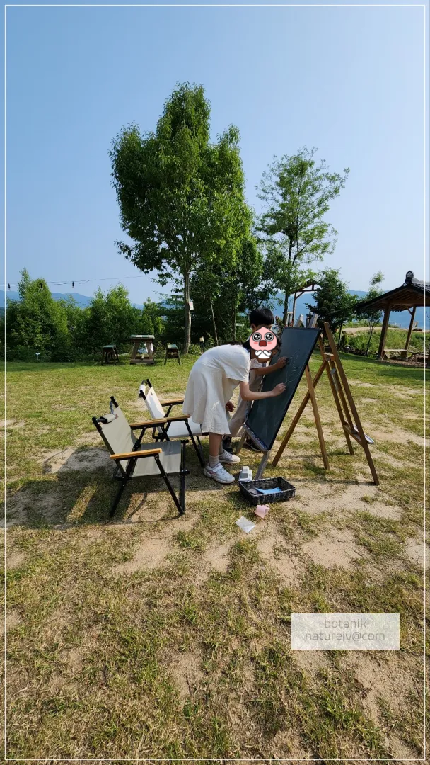 넓은 잔디밭에 이렇게 앉아서 분필로 자유롭게 그림을 그릴 수 있는 이젤이 있어요.