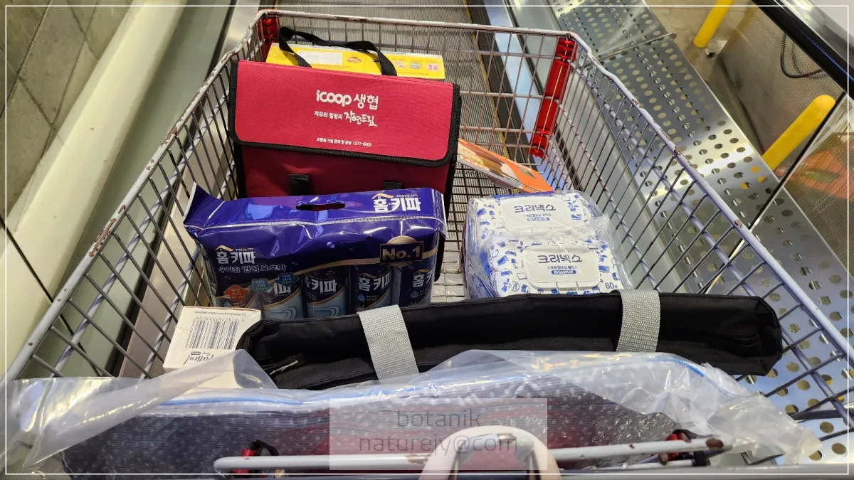 아무래도 여름이다보니 냉동 식품 살 것을 예상하고 집에서 미리 보냉백에 아이스팩을 챙겨갔어요.
